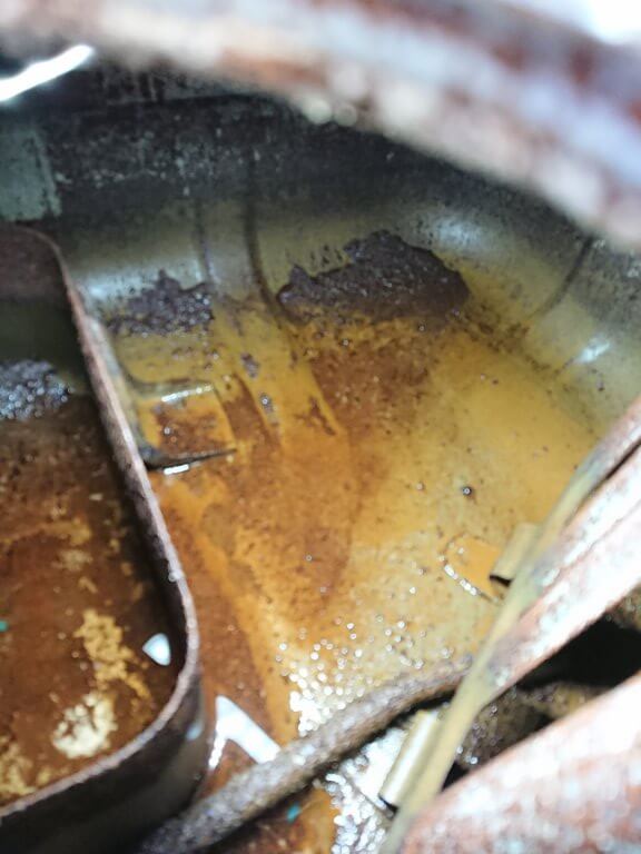 燃料タンクを降ろすとご覧のようにタンク内の腐食がかなり進んだ状態であり、サビがサブタンクへの通路を塞いでいる可能性が非常に高いです!