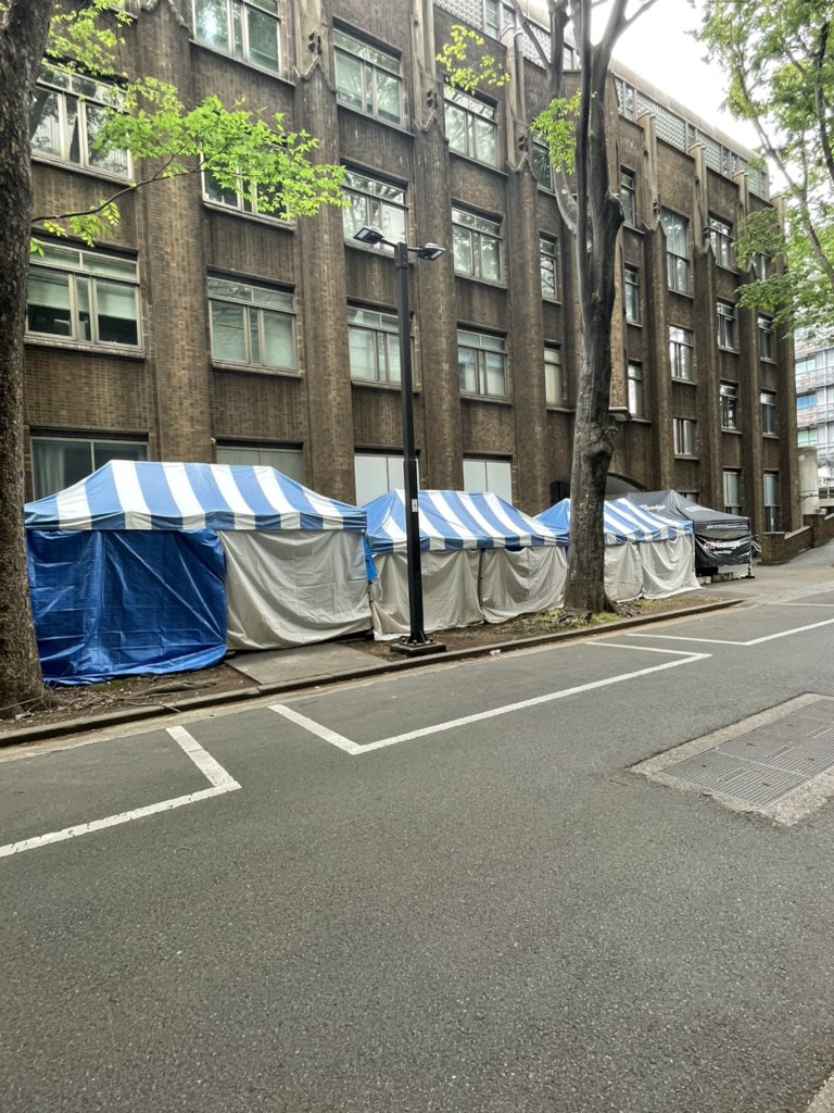 天気予報では小雨模様との予報なので、防雨用テントと横幕で明日に備えます。