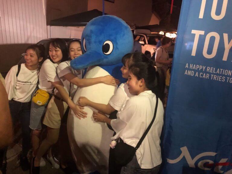 ネッツトヨタ富山魚津店のブースに誘導するように手前の道路でアピール全開!子ども達にはいつものように好評だったけど、ベトナム人のみなさんの反応の良さにビックリしました。ハグしたり、キスしたり、怖がったり(笑)、予想以上の食いつきの良さでした!