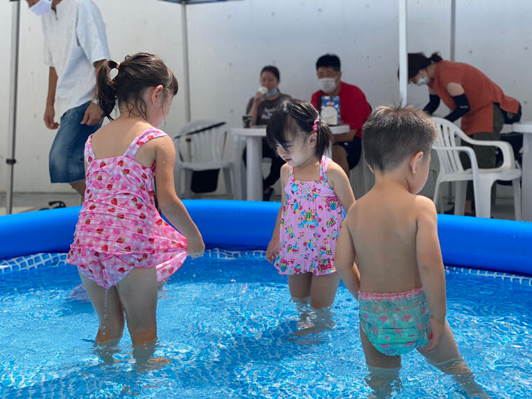 お母さん方はテントの中に避難してますが子供たちは冷たいプールに大満足!!