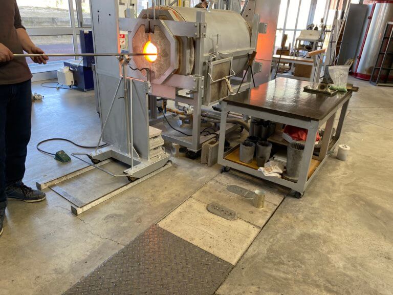 この大きめな釜の中には熱して溶けたガラスの原料が入っています。