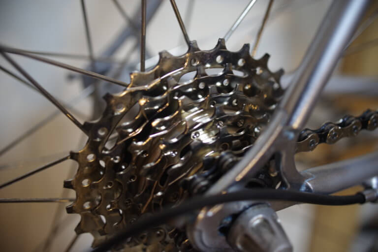 本来、6段使用のフレ-ムに7段を装着すると、トップギヤがフレ-ムに干渉するので、リヤハブのスペ-サ-で、3ミリ程度ホイ-ルを左側にずらしてみました。