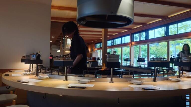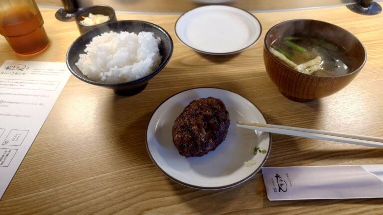 席は全席カウンターで、一人一人の前に炭火と網がありその上においてくれました。小ぶりのハンバーグを3つ ひとつづつ提供されて頃合いを見て次を出してくれます。