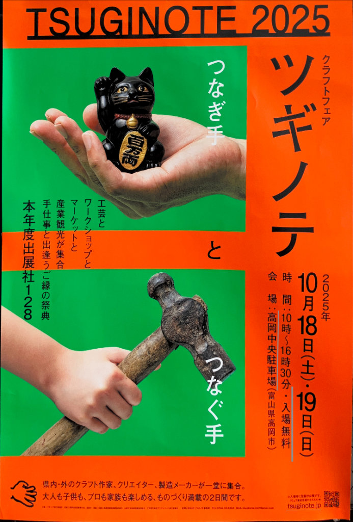 こんにちは、高岡店 今井です!全国のクラフト作家とモノづくり職人たちが、高岡市で一堂に会す「ツギノテ」子供から大人まで、モノづくりを楽しめる2日間です!