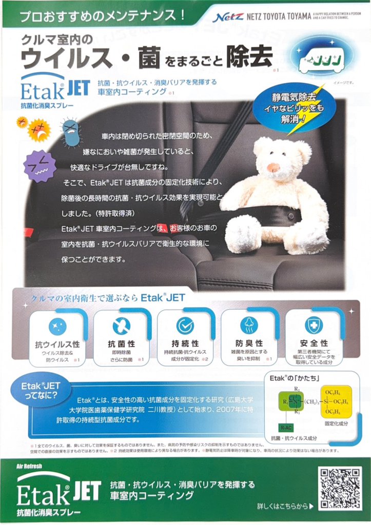 Etak JETは、車内などの室内空間を対象にした抗菌・抗ウイルス・消臭コーティングスプレーで、車内のシート、床、ドアパネル、ハンドルなどに施工を行います✨