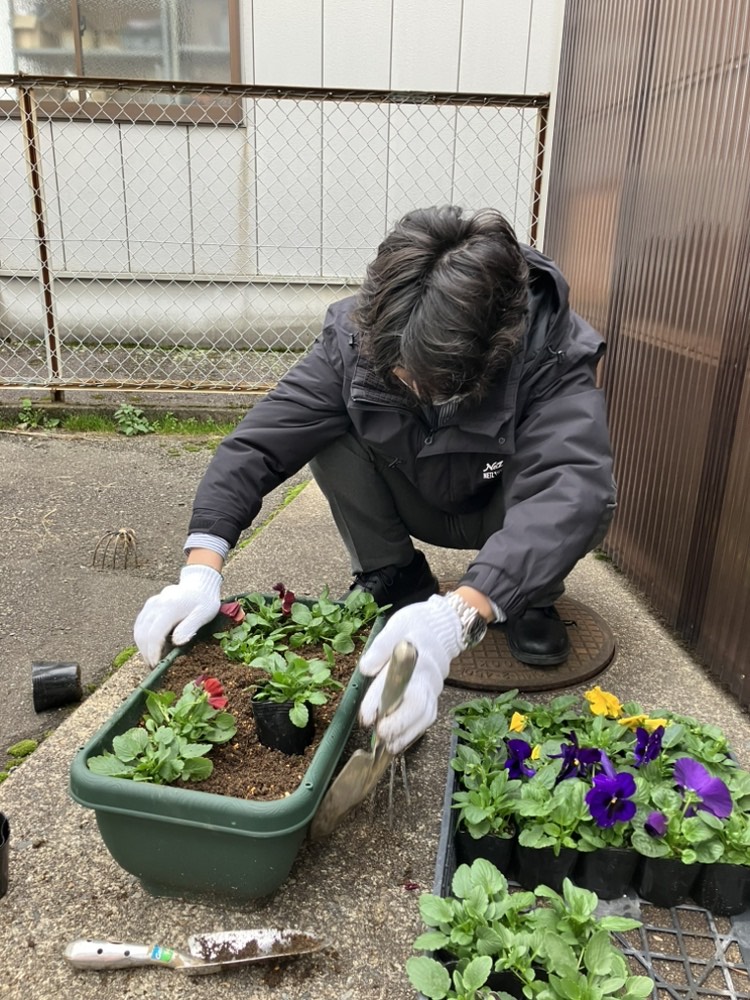 今回は、店舗の男性スタッフのみで、ガラにもなくお花を植えて、きれいなプランターを作成した様子をお届けします!🌻