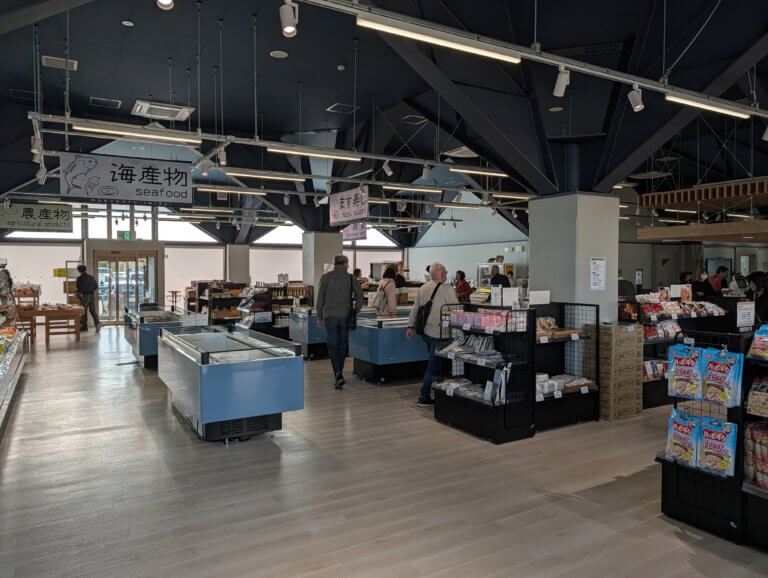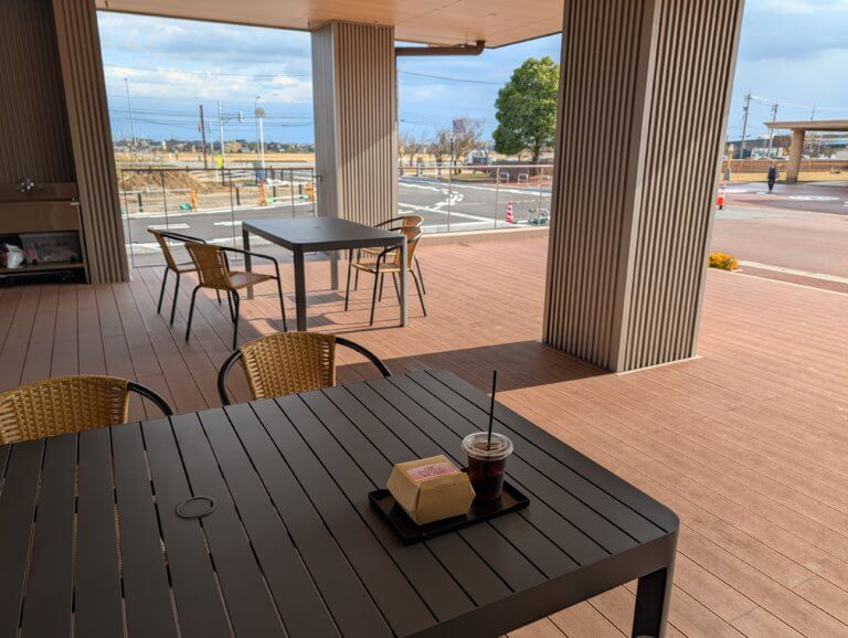 「物産館」と「食遊館」の建物の間は以前は道路だったのですが、リニューアルして広場に変わっていました。これからは地域のイベントスペースとしても活用されるのだと思います。
