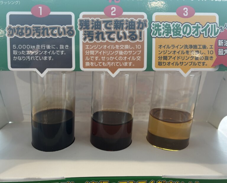 真ん中は残油状態の新オイル、そして右は当店のエンジンオイル洗浄を行った後のオイルです。